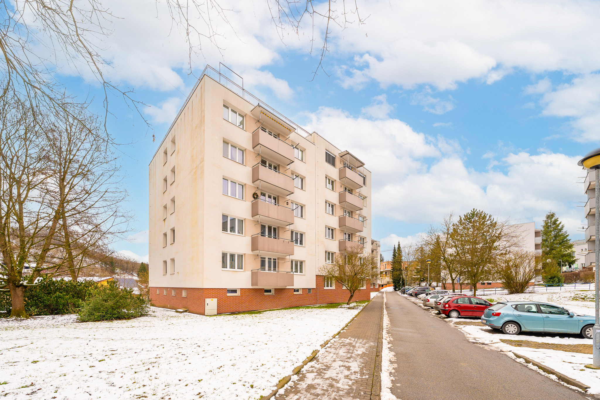 Parkování je možné v okolí domu, kde je i příjemná zeleň.