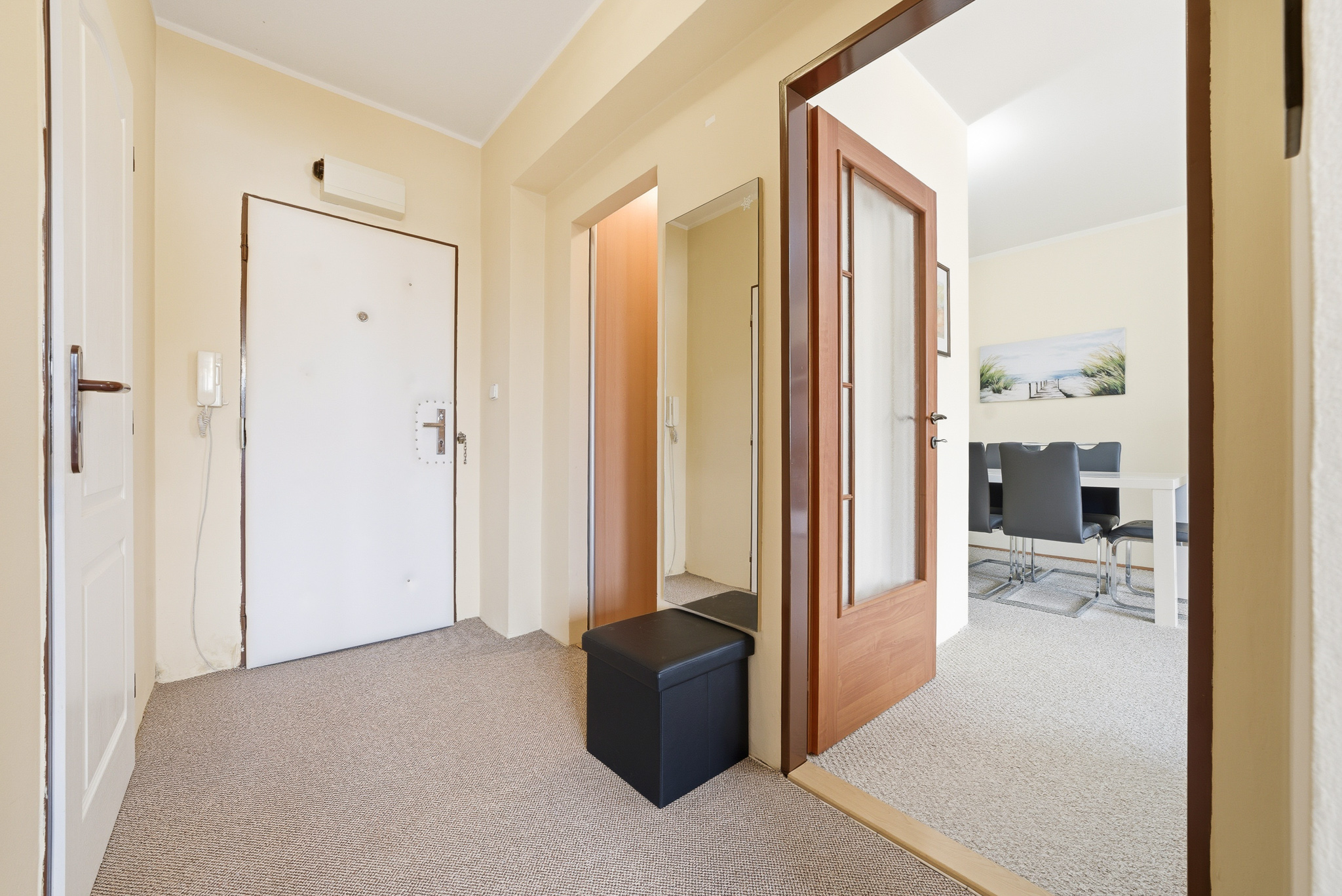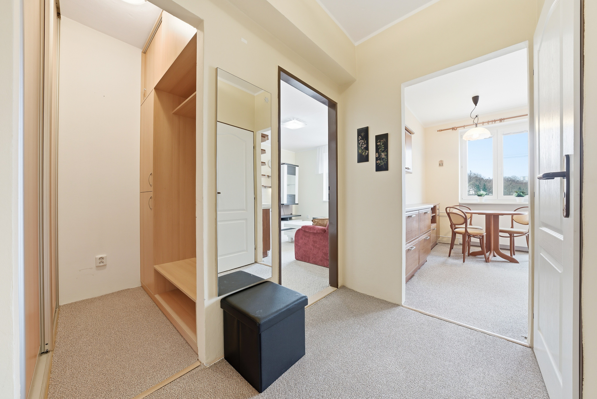 Jednotka se skládá ze vstupní chodby s přilehlou šatnou, obývacím pokojem, samostatnou toaletou a zděnou koupelnou se sprchovým koutem a místem na pračku. Přes průchozí kuchyň s jídelním koutem je přístupná ložnice.