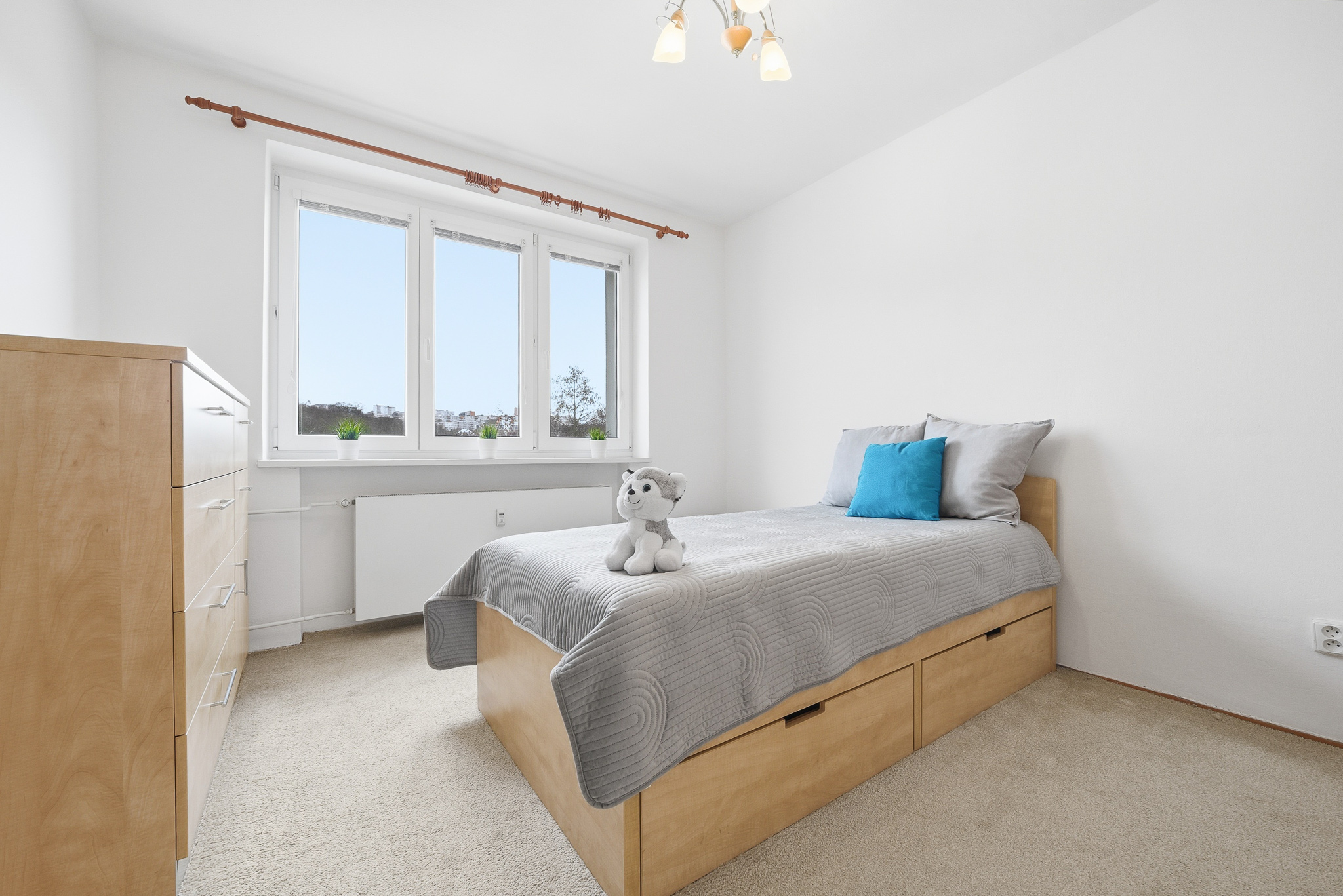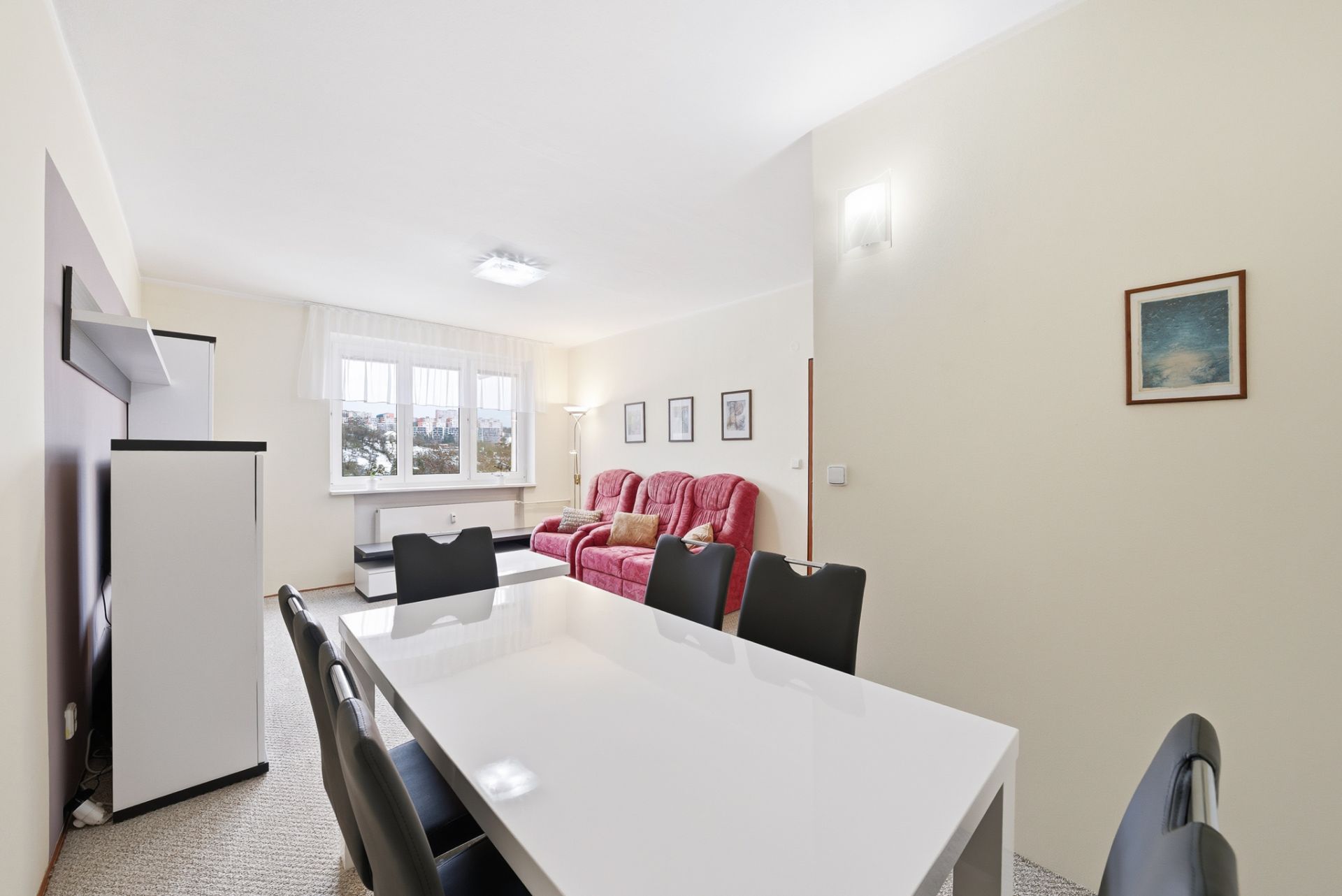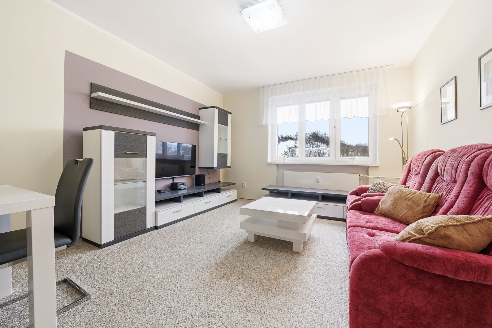 Podlahovou krytinu tvoří v celém bytě koberec, pouze v koupelně a na toaletě je dlažba. Okna jsou plastová dvojskla včetně vnitřních žaluzií.