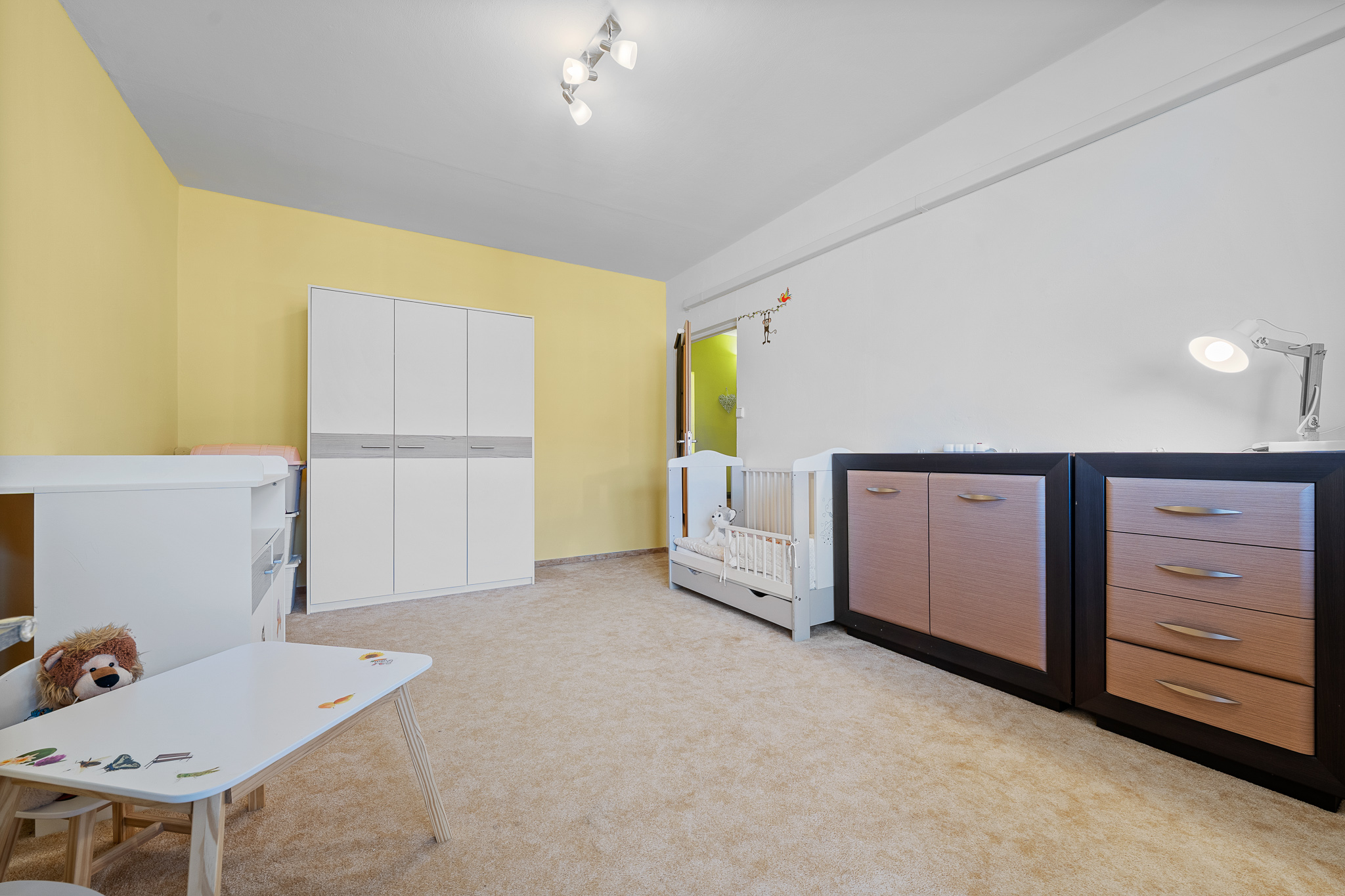 Podlahovou krytinu tvoří v pokoji koberec, v ložnici plovoucí laminátová podlaha, v obyváku a v kuchyni vinyl, v chodbě, v koupelně a na toaletě je dlažba.
