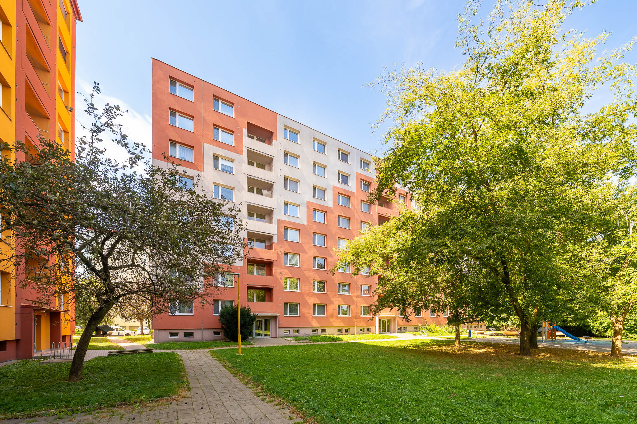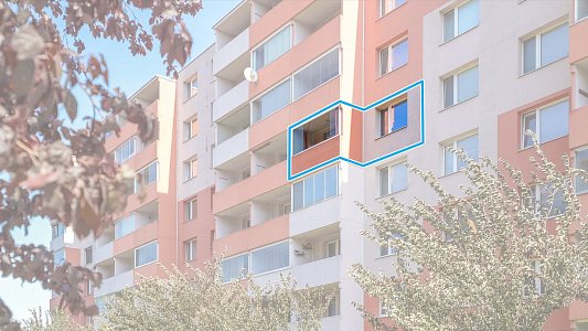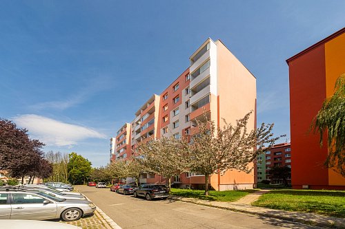 Byt v osobním vlastnictví se nachází v pátém nadzemním podlaží z osmi samostatně stojícího panelového domu s výtahem. Je po částečné rekonstrukci.