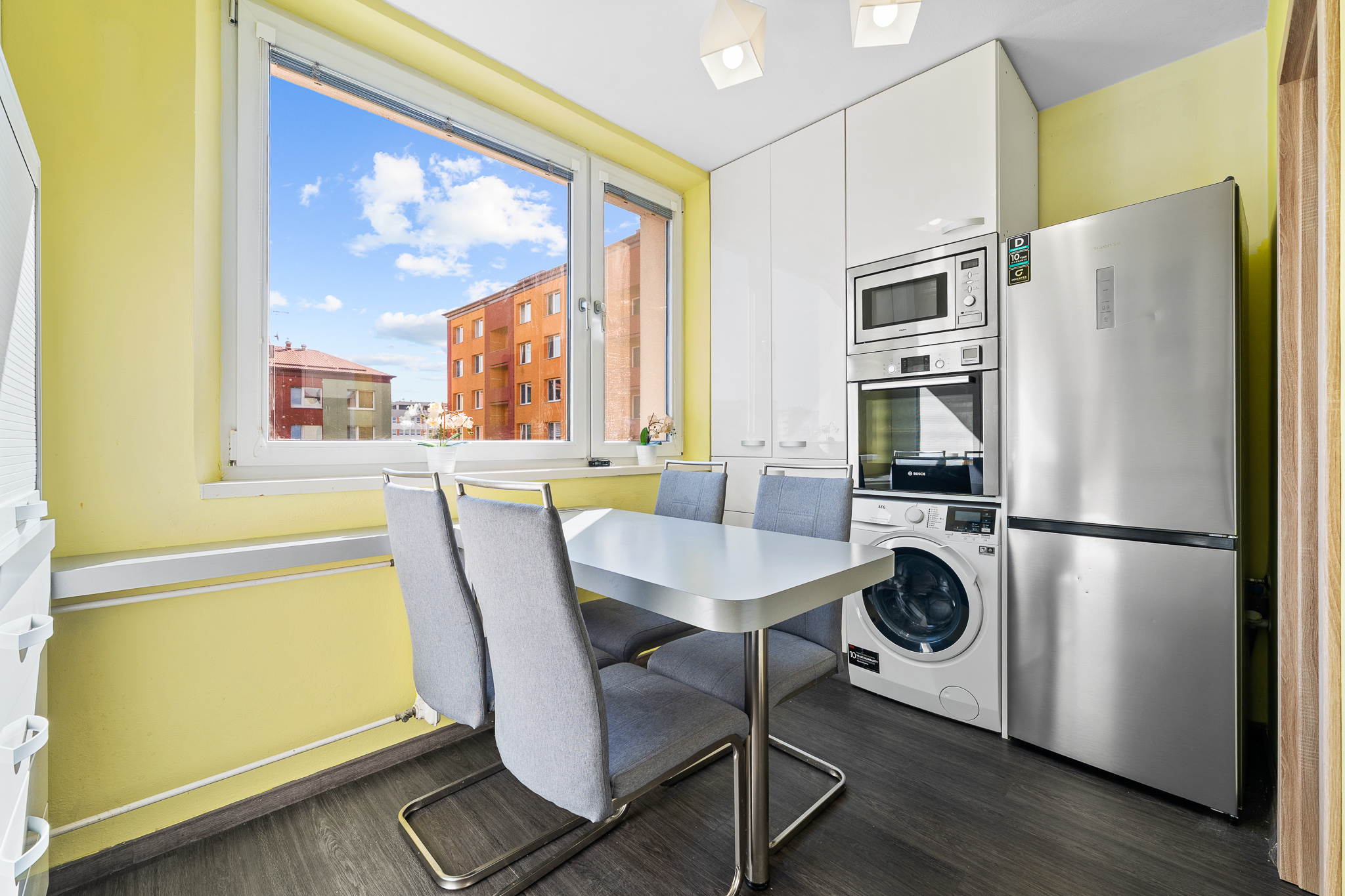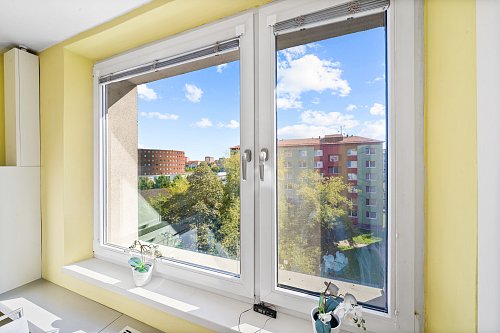 Okna v bytě jsou plastová dvojskla včetně vnitřních žaluzií a sítěk proti hmyzu. Do koupelny jsou interiérové posuvné dveře do pouzdra včetně obložkové zárubně.