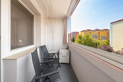 Jednotka se skládá ze vstupní chodby s úložnými prostory, ze které se vchází do jednotlivých místností - kuchyně s jídelním koutem, obývací pokoj, ložnice s vestavěnou skříní, pokoj s výstupem na zasklenou lodžii o velikosti cca 5 m2, samostatná toaleta a z kuchyně přístupná koupelna.