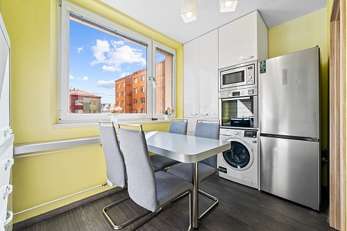 Kuchyňská linka zhotovená na míru nabízí spoustu úložného prostoru a je včetně vestavěných spotřebičů - indukční varná deska a trouba Bosch, myčka Miele, mikrovlnná trouba Mora, lednice Hisense a digestoř. Dřez je granitový. Zásuvky jsou včetně tichých dojezdů. Pod troubou je zhotovené místo na pračku.