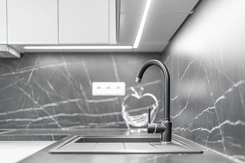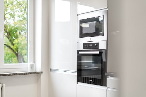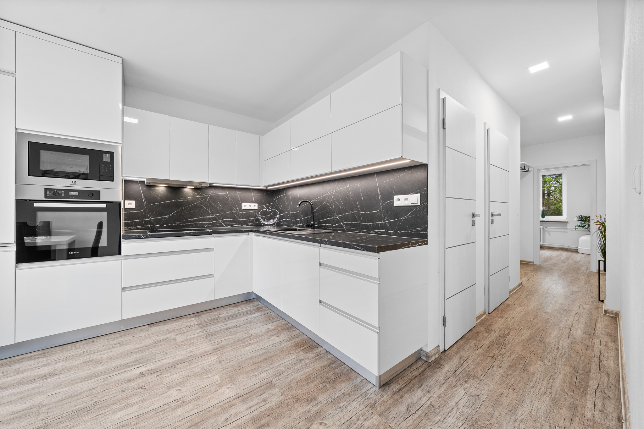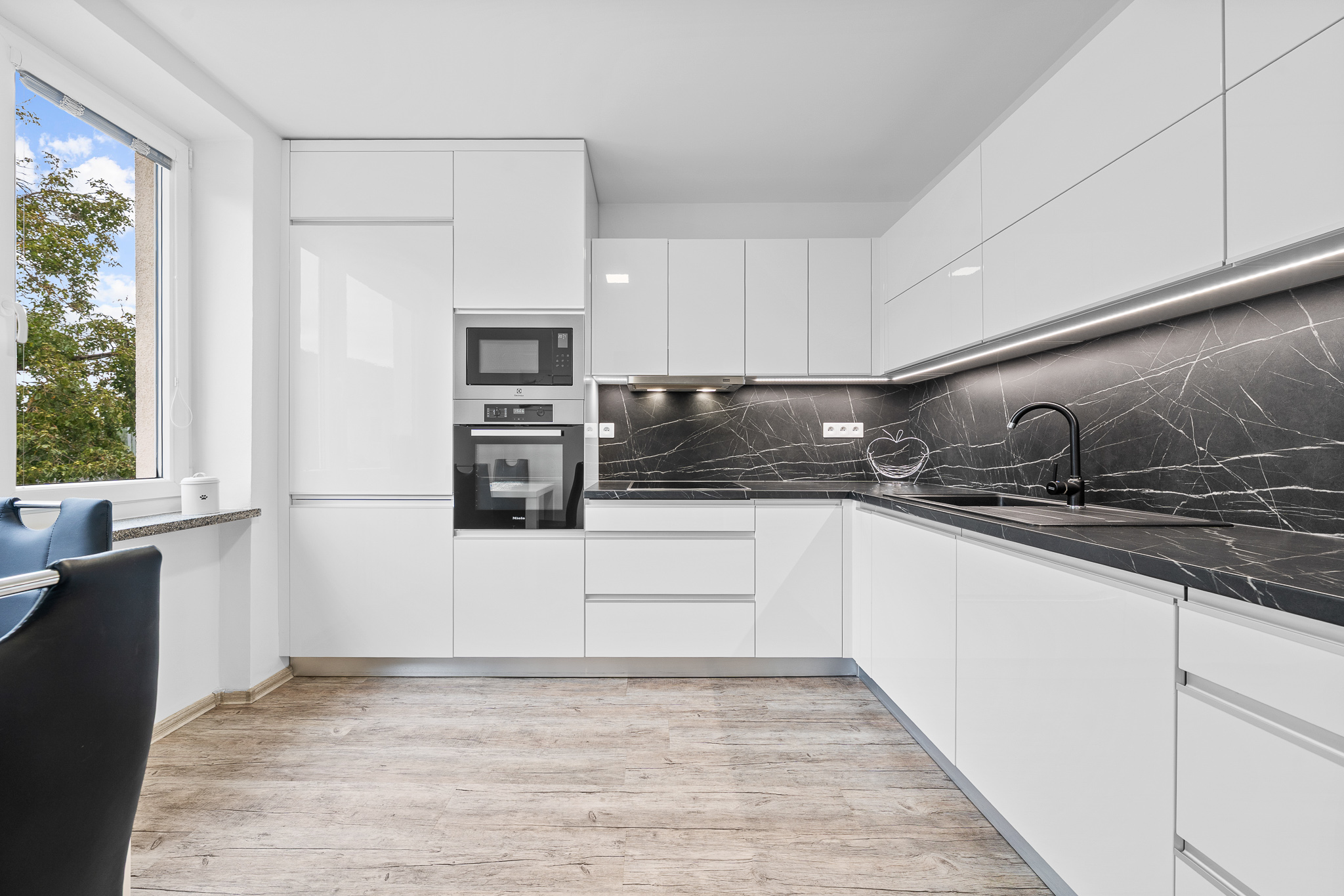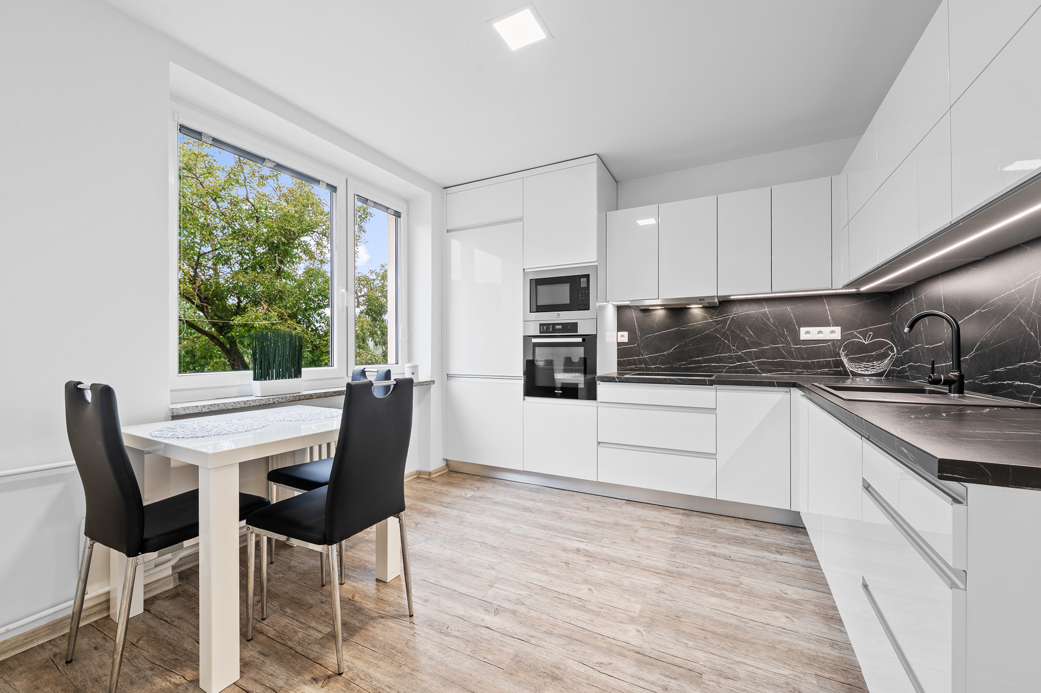 Kuchyňská linka ve vysokém lesku nejvyšší kvality je zhotovená na míru od stolaře pana Janocha. Je podsvícená led páskem a s vestavěnými spotřebiči - indukční varná deska a trouba Miele, myčka Bosch, mikrovlnná trouba Electrolux, lednice Whirlpool a digestoř Franke. Granitový dřez Franke. Kování Blum, zásuvky s tichými dojezdy.