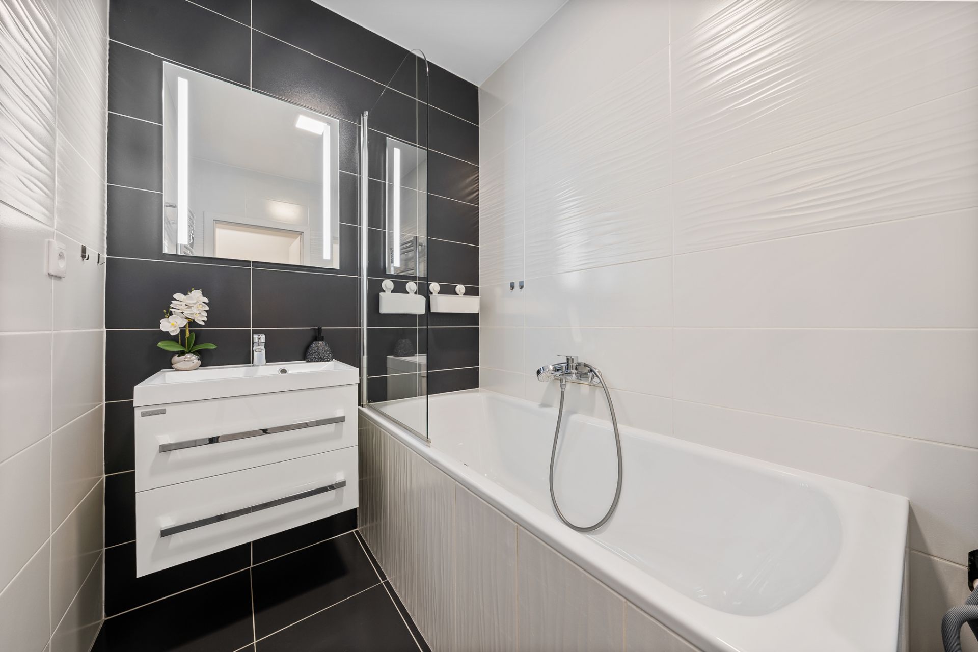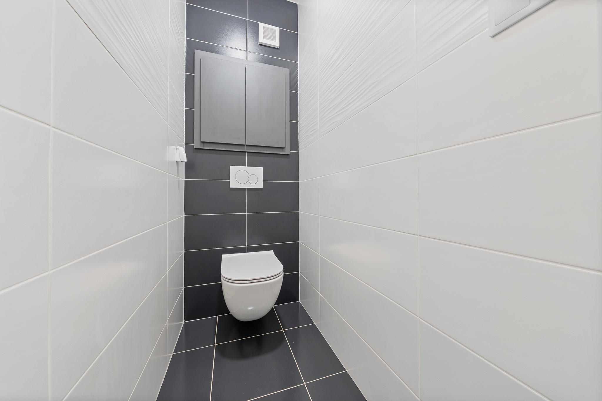 V koupelně vana se zástěnou a místo pro pračku. Toaleta je značky Geberit.