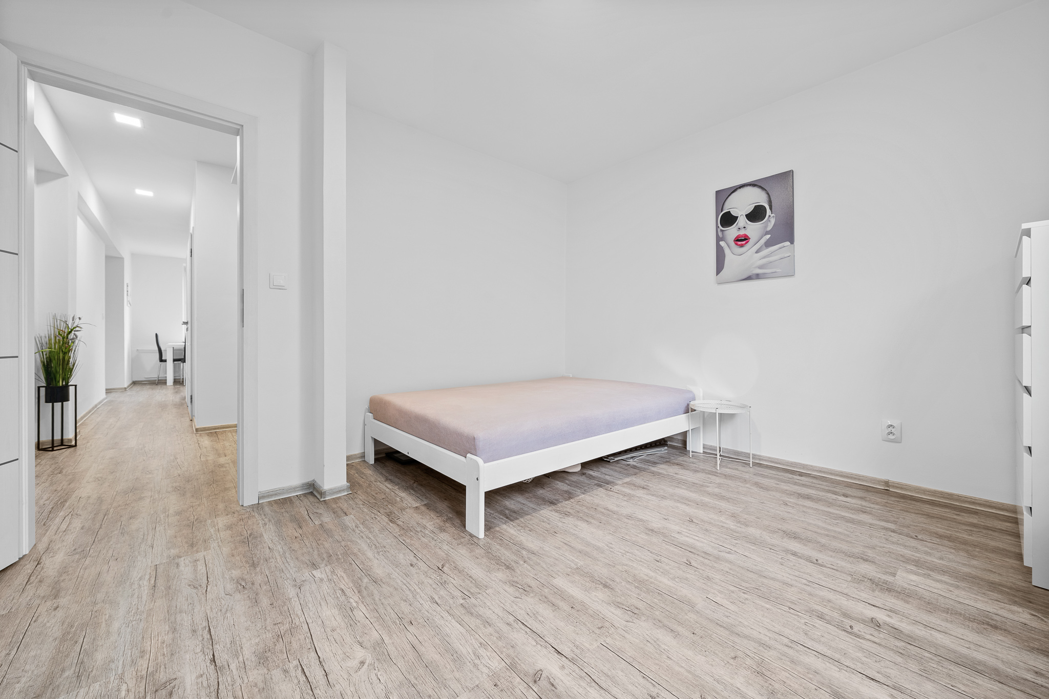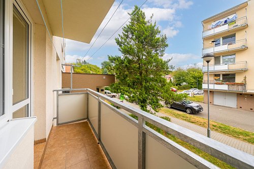 Jednotka se skládá ze vstupní chodby s vestavěnou šatní skříní, na ni volně navazuje kuchyně s jídelním koutem. Další místnosti jsou přístupné z chodby a jsou neprůchozí - obývací pokoj s balkónem o velikosti cca 4 m2, ložnice také s balkónem o velikosti cca 4 m2, pokoj, koupelna a samostatná toaleta.