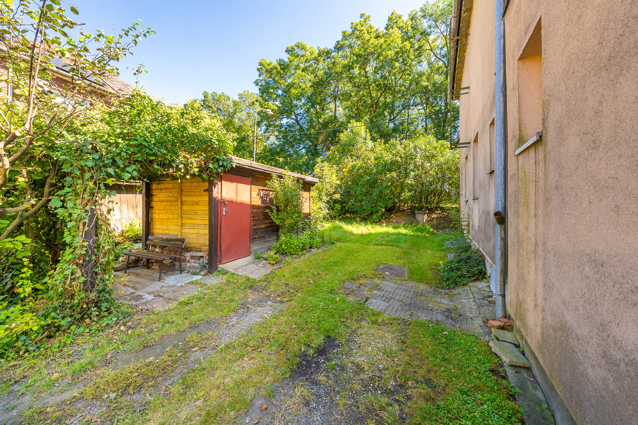 Na pozemku stojí dřevěný domek vhodný k uložení například zahradních věcí a nářadí.