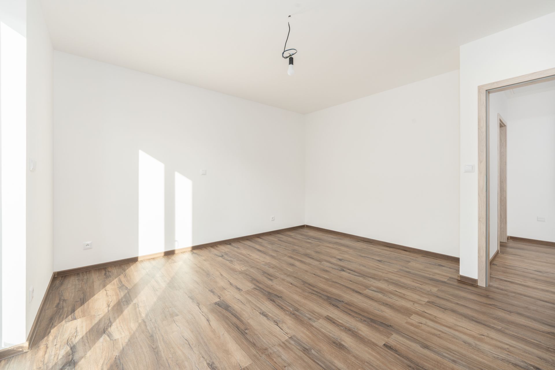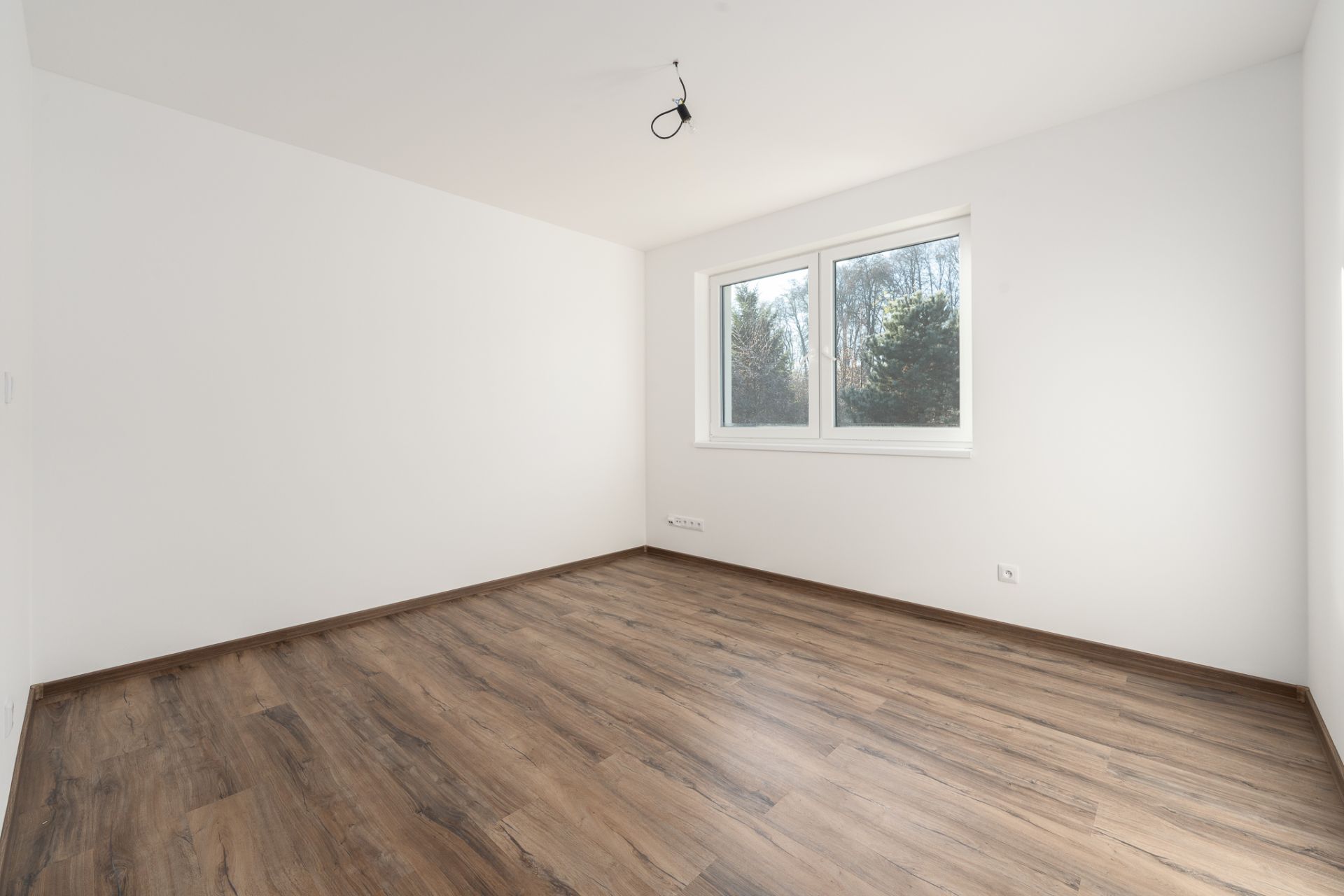 Okna značky Decro Bzenec jsou plastová izolační trojskla. Součástí budou i venkovní hliníkové žaluzie na dálkové ovládání. Jeden pokoj má francouzské okno s přímým vstupem na zahradu.