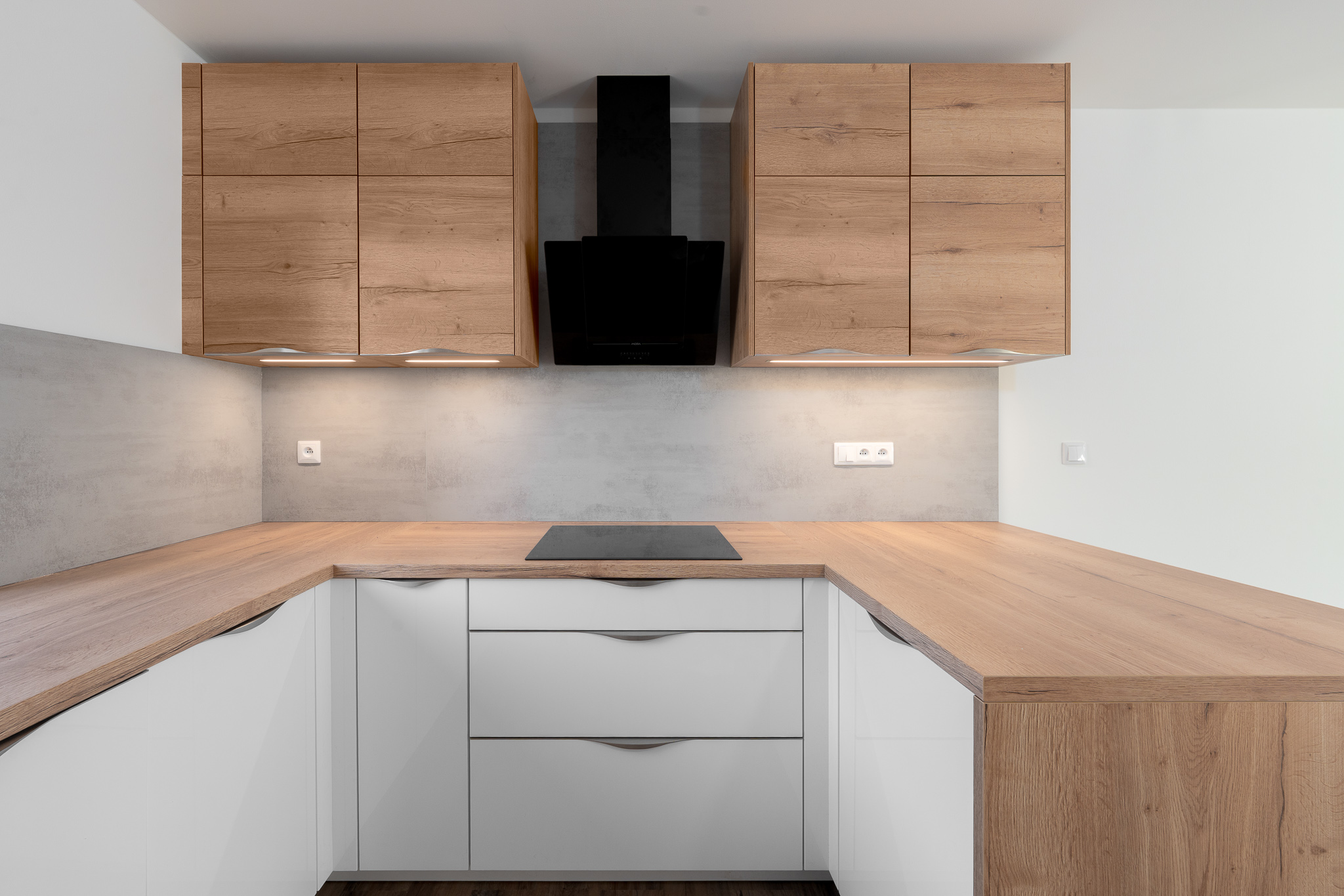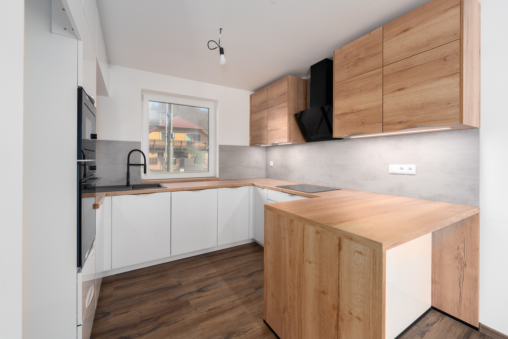 Kuchyňská linka zhotovená na míru od Möbelix Německo je se spotřebiči a vybavením - trouba a myčka Whirlpool, mikrovlnná trouba Gorenje, varná indukční deska a digestoř jsou značky Mora a granitový dřez. Je vaším snem lednice s ledovačem? I na tuto možnost bylo při stavbě pamatováno a u prostoru pod troubou je připraven vývod vody.