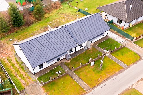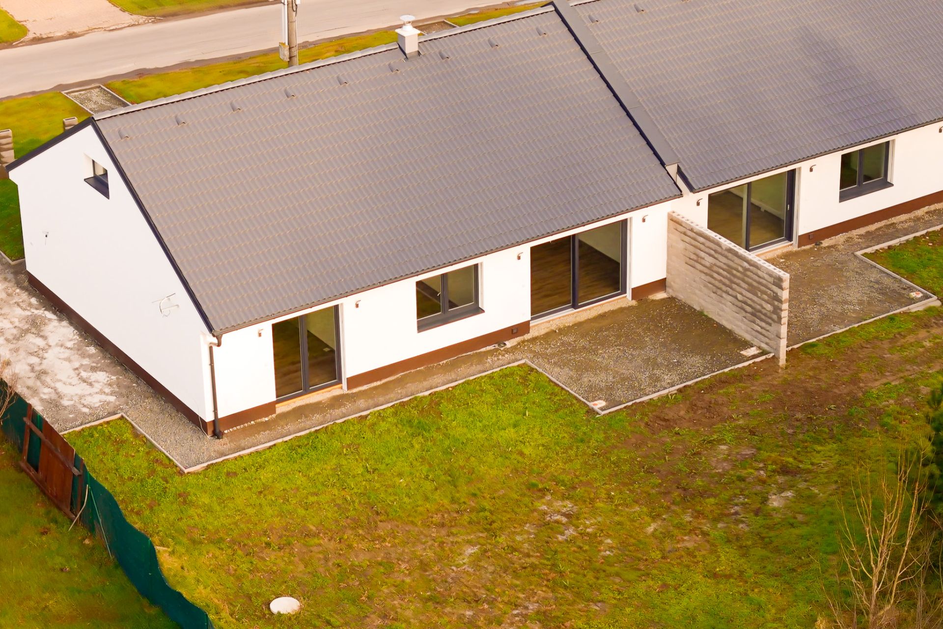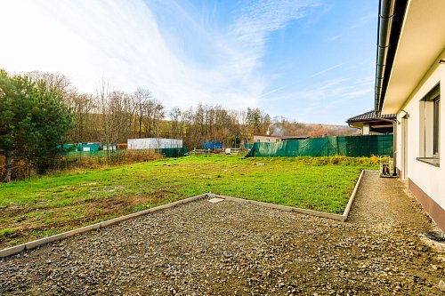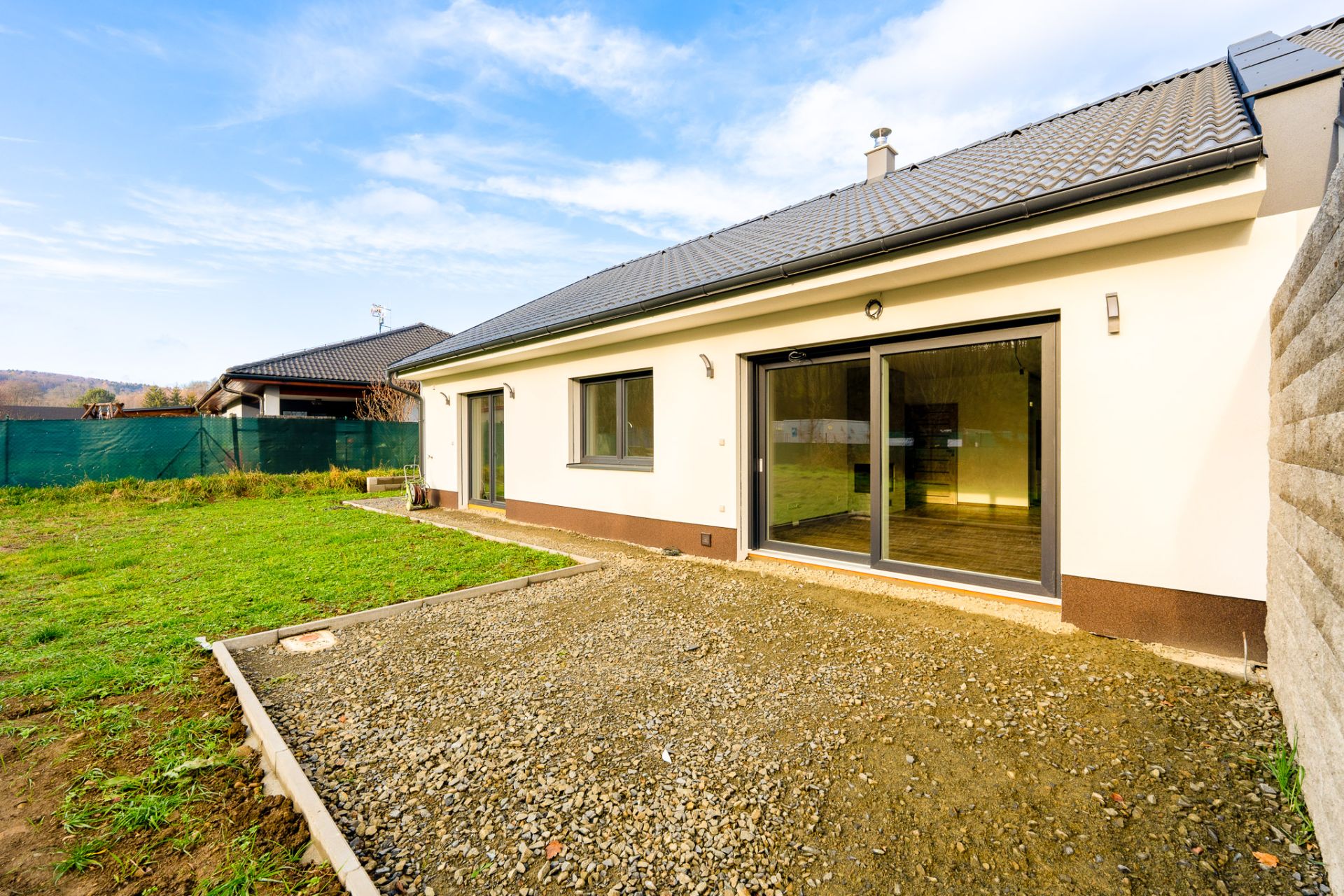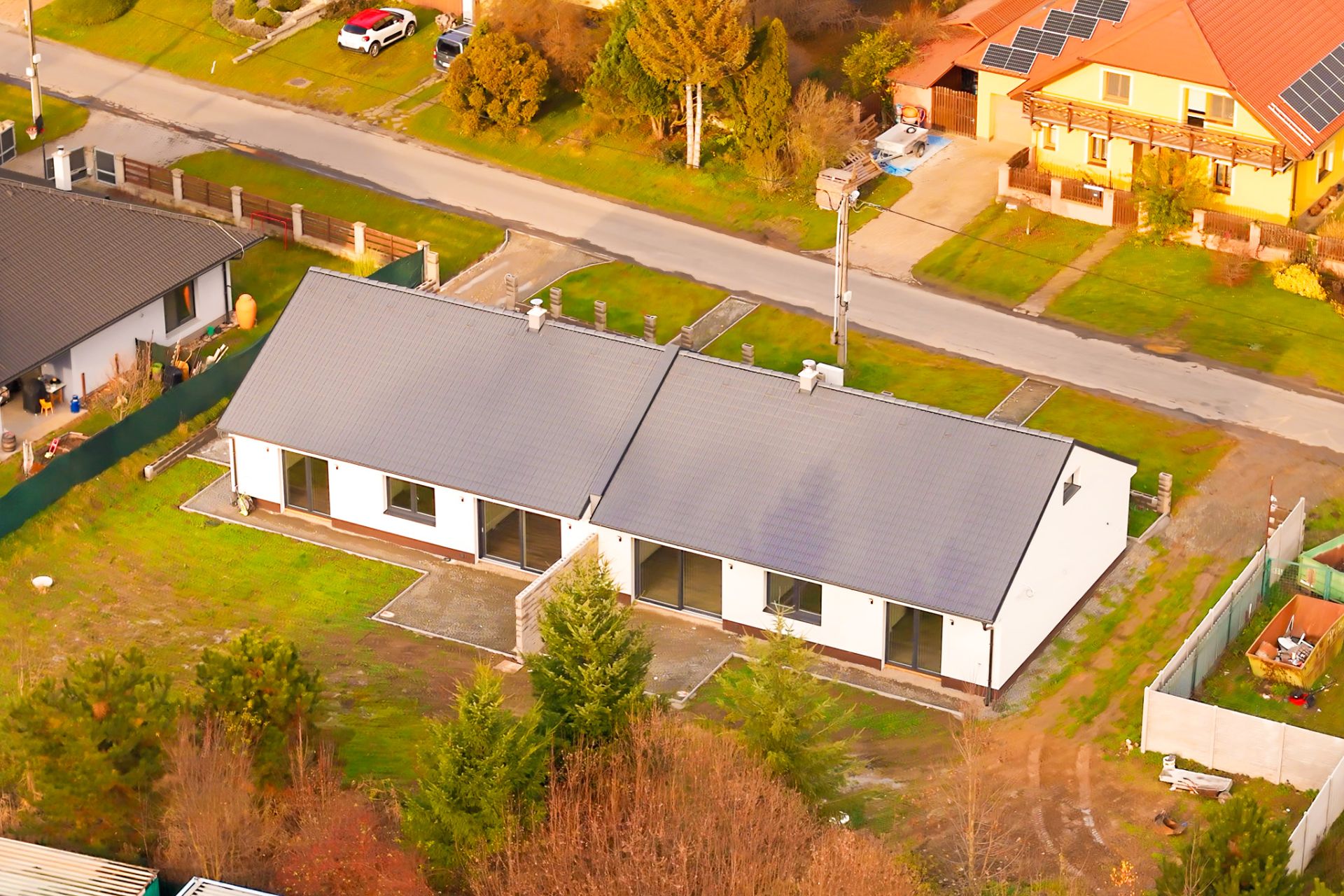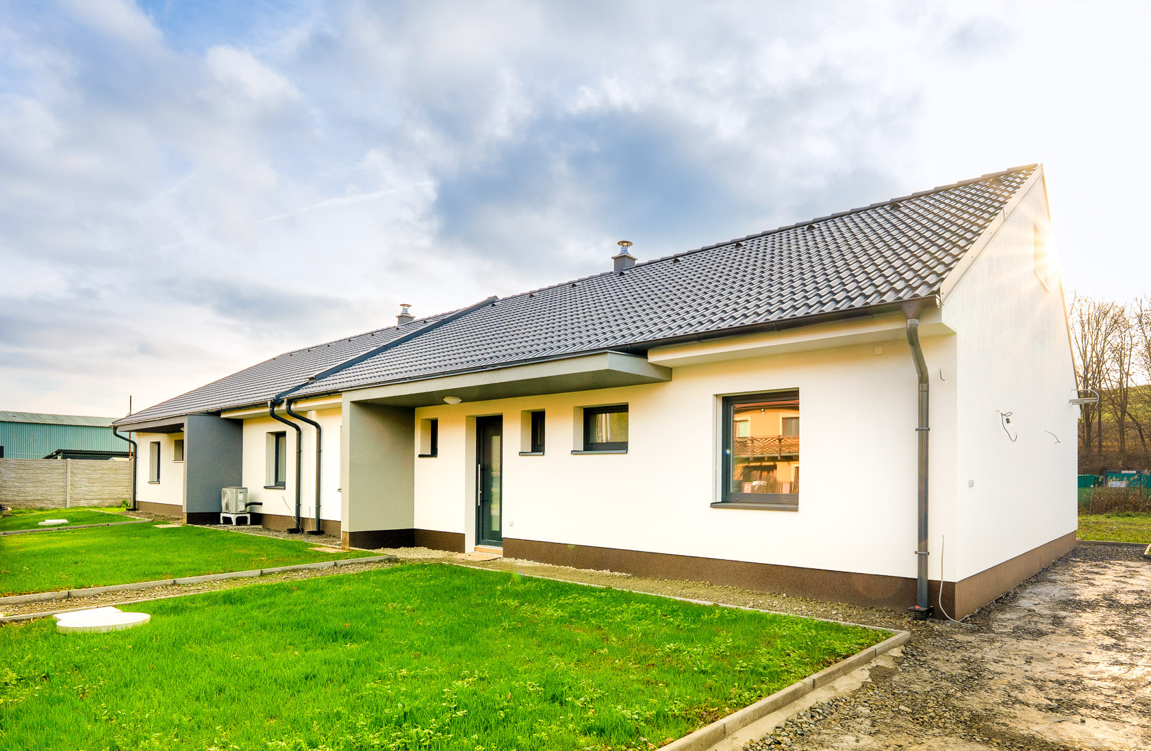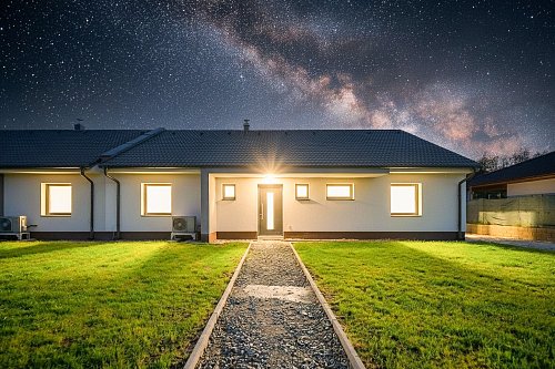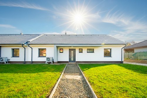 U domu bude dokončeno: přístřešek s vydlážděním pro dvě auta, příprava pro pojezdovou bránu, chodník kolem celého domu s terasou, plot v zadní části pozemku, klimatizace.
