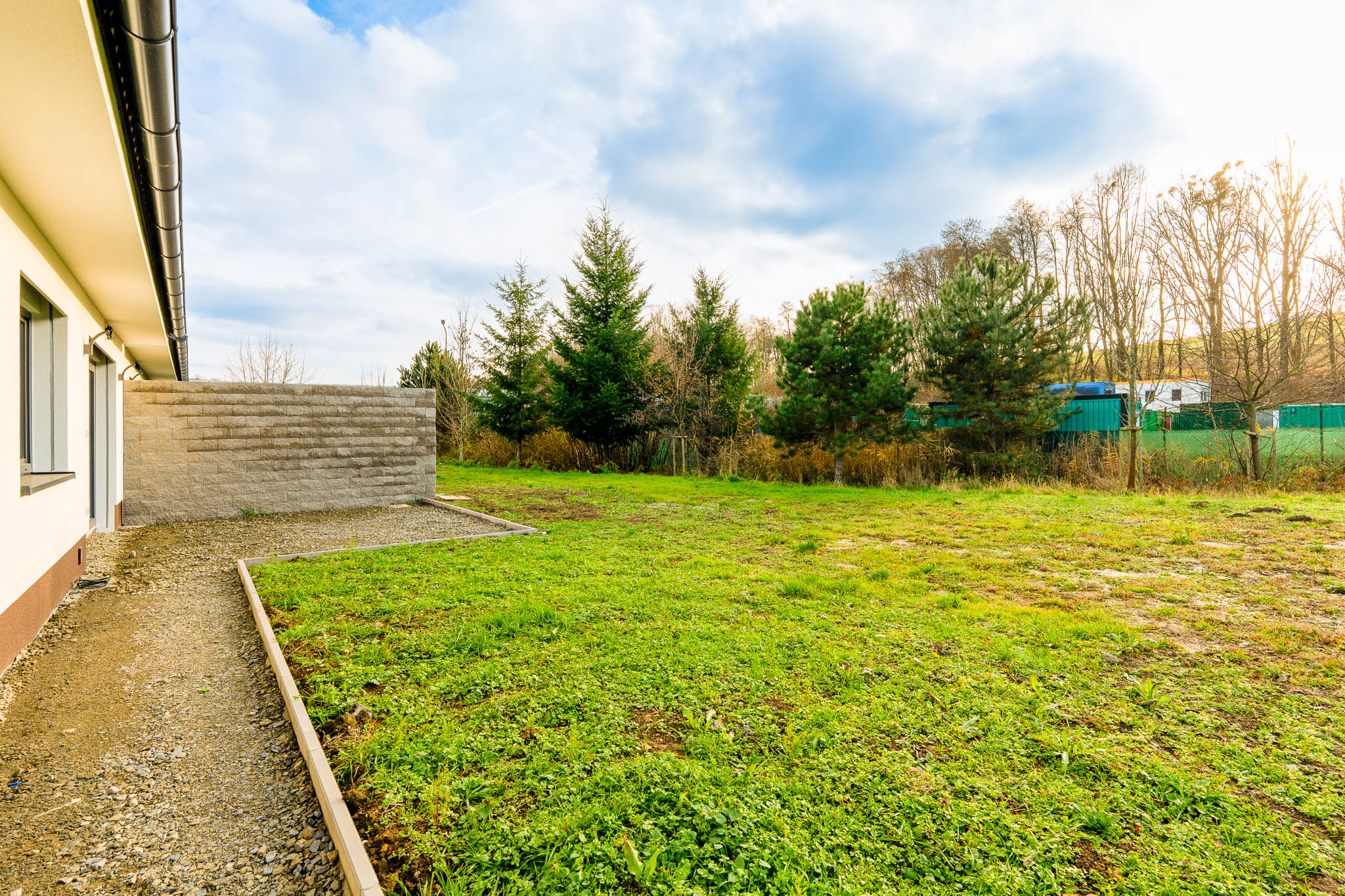Zahrada je rovinatá a je v plánu celkové oplocení. Nabízí prostor na vybudování bazénu, pískoviště nebo záhonů na pěstování vlastní zeleniny. Nachází se zde retenční nádrž o objemu 4 m3. Ze zadní strany domu je vyvedený vodovodní kohoutek.