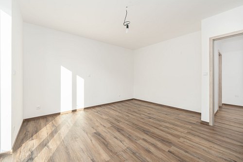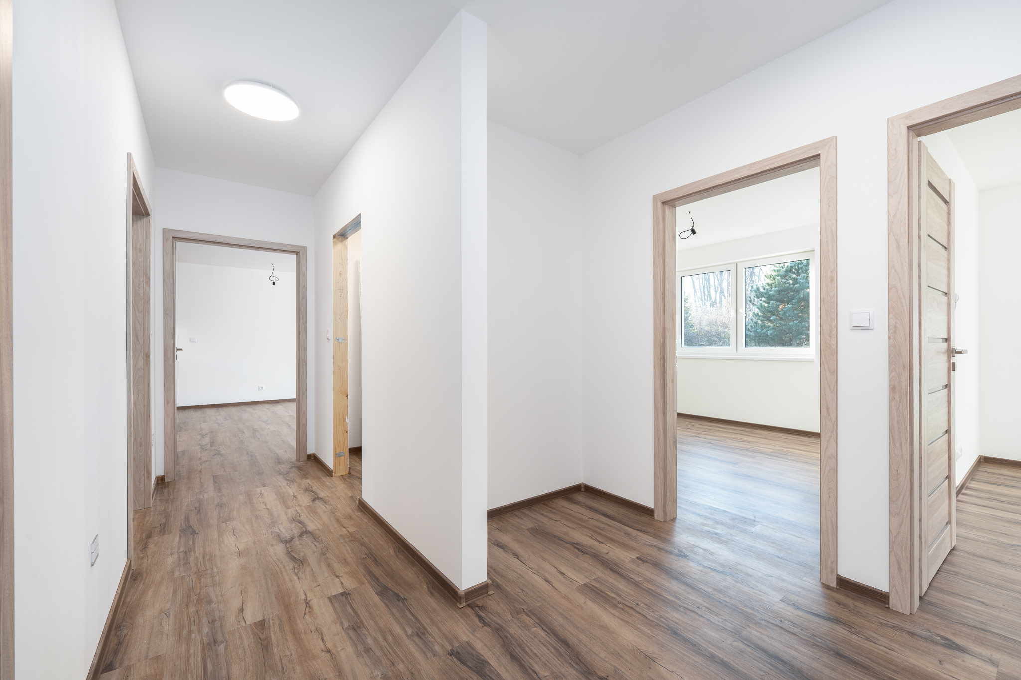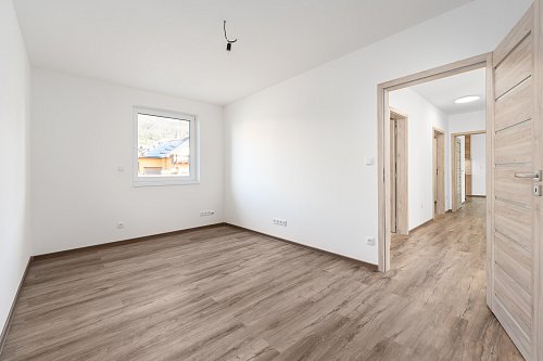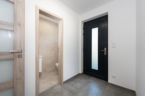Za vstupními dveřmi se nachází předsíň, samostatná toaleta a technická místnost s přípojkou na pračku. Dále je zde chodba se vstupy do jednotlivých místností, které jsou neprůchozí - obývací pokoj s kuchyňským koutem, šatna, tři pokoje a koupelna s vanou, sprchovým koutem a toaletou.