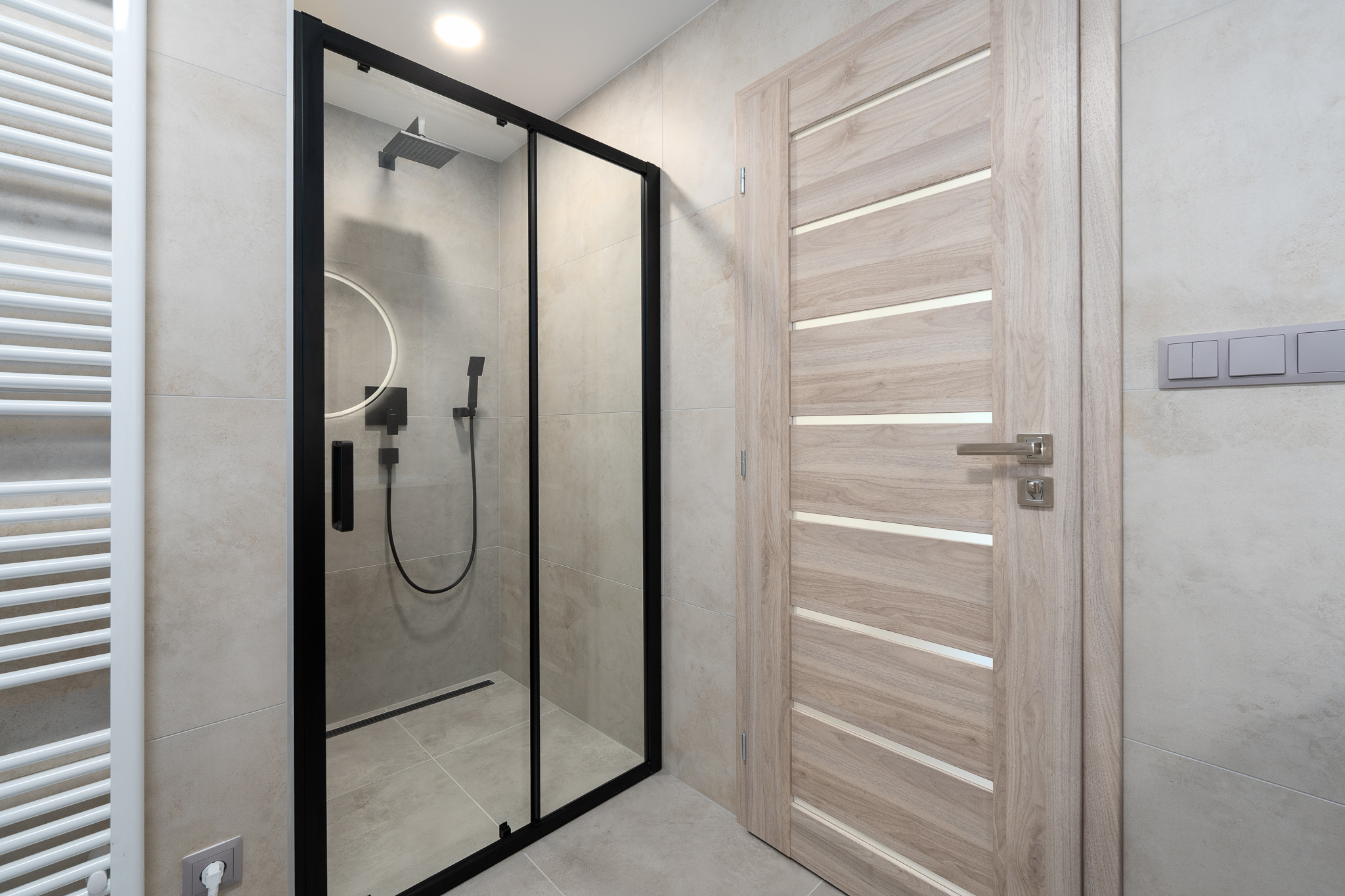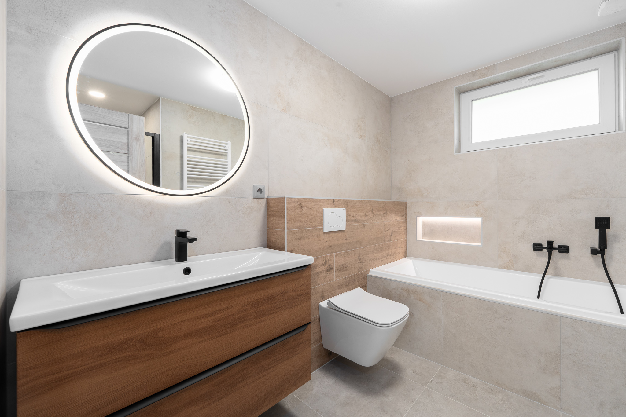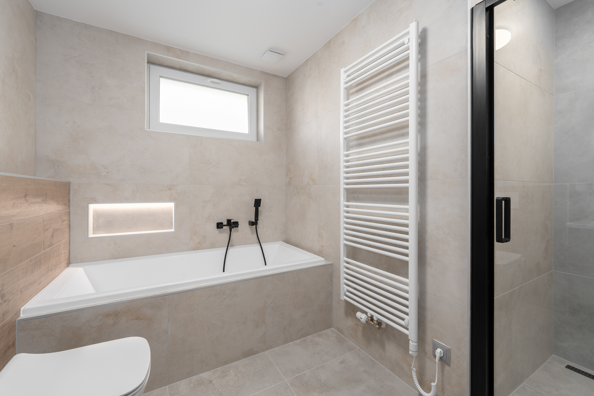 Koupelně dominují velkoformátové obklady a podomítková sprchová baterie. Toalety jsou se splachovacím systémem značky Geberit.