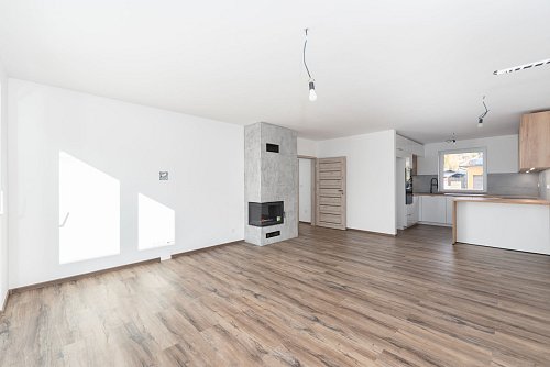 Dominantou obývacího pokoje je krb Nordflam na dřevo a brikety. Tento prostor je prosvětlený HS portálem s posuvnými dveřmi, kterými vejdete na terasu o ploše cca 23 m2 s přípravou pro hliníkovou pergolu.